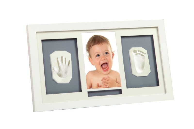 Kako drobna je ročica našega dojenčka in kako mala so njegova stopala. Ohranite ta spomin s setom, kjer boste lahko odtisnili malčkove roke in noge v posebni penasti mehki masi. Set vsebuje 1 x okvir za dva odtisa in 1 sliko, 2 x masa 50g, valjček, lepilni trak, navodila. Barva ozadja: siva. Velikost okvirja 40 cm x 23,5 cm. Primerno za starost 0,1,2,3 let.