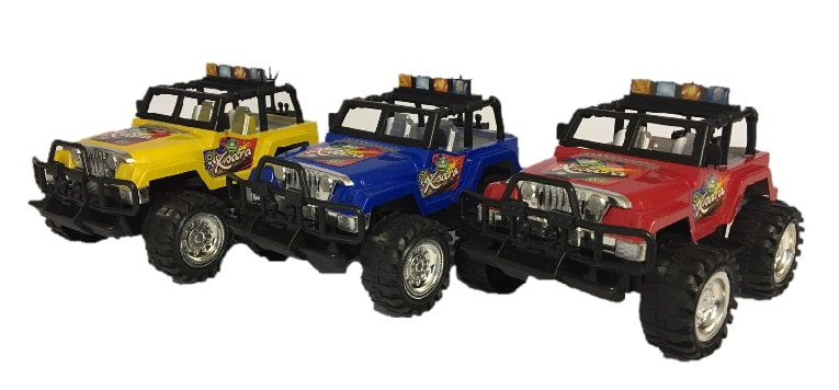 Atraktivni 20 cm jeep z katerim se z veseljem igra vsak malček. Vozilo deluje na vztrajnik in je v večih barvnih kombinacijah (rumen, rdeč, moder). dizajn avtomobilčka popestrijo tudi atraktivne nalepke. Z njim otroci raziskujejo neznane poti in ob tem izredno uživajo! Primerno za starost od 3. leta dalje.