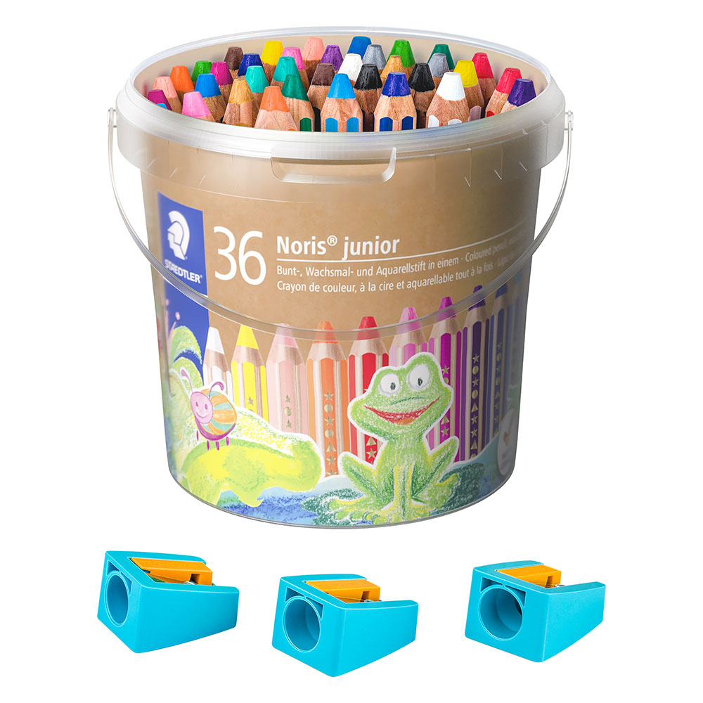 Debele barvice 3 v 1: barvica, voščenka in vodna barvica, ki puščajo mehko in barvno bogato sled že pri minimalnem pritisku. Zasnovane posebej za majhne otroške roke (2+). Primerne za ustvarjanje po papirju, kartonu, steklu in drugih tudi temnih površinah. Odporne na udarce, zaradi posebne oblike držala se ne kotalijo. V vedru je 36 barvic in 3 šilčki z zaščito za roke.