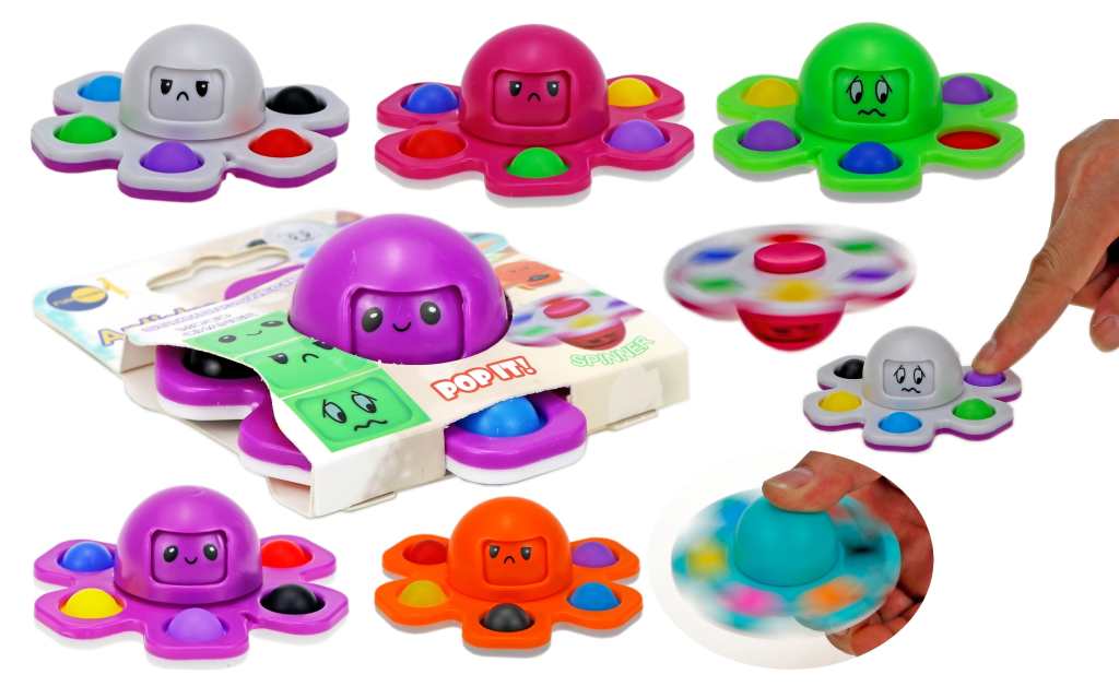 Fidget spinner in hobotnica razpoloženja 2 v 1 Hobotnica se vrti in pri vrtenju menja razpoloženje. Deluje antistresno in ima pop it čepke za stiskanje. Velikost Fi9cm, višina 3,5cm. Primerno za starost 3l+