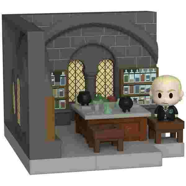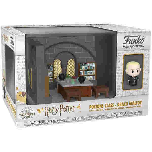 Zberite se v razredu za čarobne napoje in usedite se za mize s svojimi partnerji za kotličke. Zberite in sestavite učilnico za čarobne napoje za svojo Harry Potter zbirko s Funko Mini Moments Potions Class – Draco Malfoy. Obstaja možnost, da boste našli chase set Mini Moments Potions Class with Tom Riddle. Vsaka fugurica pride s koščkom kompleta, tako da lahko ponovno ustvarite učilnico v podzemlju Bradavičarke za svojo zbirko.