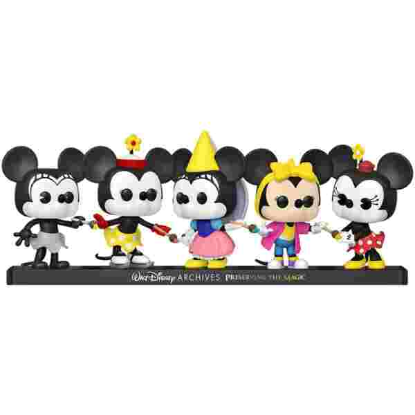 Vseh 5 Minnie Mouse Pop! Vinilnih figure stoji na osupljivi podlagi Walt Disney Archives “Preserving the Magic”.