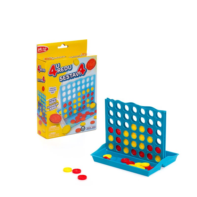 Potovalna igra. Zabavna strateška igra. Vsebina: 1 igralna predloga, 21 rdečih žetonov, 21 rumenih žetovnov. Navodila: Najprej izberite barvo žetonov. Povežite 4 žetone v vrsto vodoravno, navpično ali diagonalno. Prvi igralec s 4 žetoni v vrsti je ZMAGOVALEC. Primerno za 2 igralca. Starost 4l+