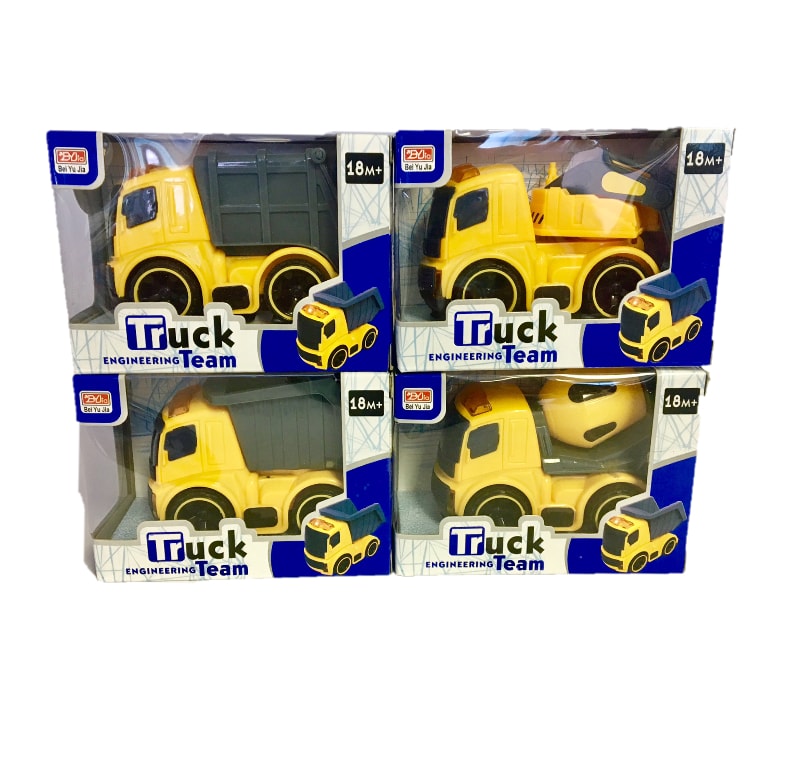 Gradbena vozila velikosti 10 x 6 x 7cm. Ob pritisku na zgornji del vozila se sprožijo svetlobni in zvočni efekti. Priložene so baterije 3 x AG13 (LR44) 1,5V Na voljo so štiri različna gradbena vozila (kamion, kamion z bagerjem, hruška ter smetar). Primerno za starost 18m+