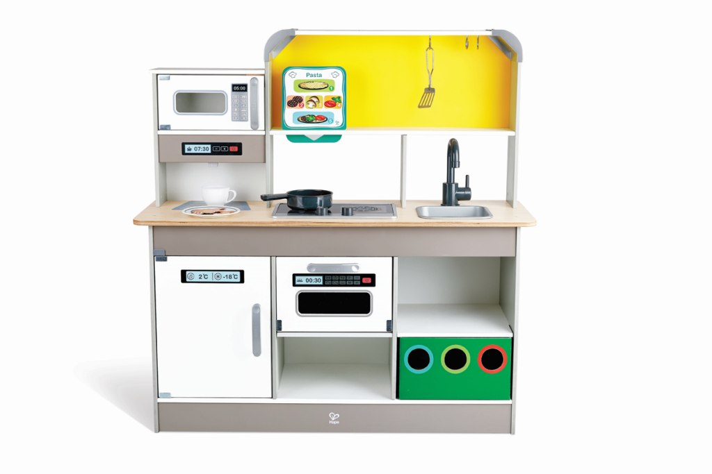 Privoščite svojim gostom čudovit obrok s to odlično kuhinjsko garnituro! Kuhinja ima prostorno igralno ploščo z električnim štedilnikom. Rdeča plošča štedilnika zasveti in zasliši se brbotajoč zvok, druga plošča cvrtnika pa zasveti modro s tehnologijo zabavnega ventilatorja, da hrana lebdi, se obrača in trese v ponvi! Vključuje koš za smeti in druge dodatke, predrezano hrano in knjigo receptov s šestimi jedmi, ki jih lahko poskusite. Velikost izdelka: 88 x 29 x 89 cm Primerno za starost 3l+