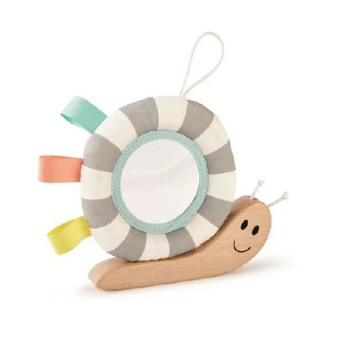Prijazen polžek v pestrih barvah vam pomaga da razveslite svojega malčka med raziskovanjem. Polžka je enostavno pritrditi na posteljico ali voziček. Ljubek in nasmejan obraz ter ogledalo na eni strani lupine, na drugi pa zveneči cvet. Odličen za razvijanje čutov in ljubezni do živali. Spodbuja vizualne spretnosti in motorične sposobnosti. Naj bo igra zabavna in poučna hkrati. Velikost polžka 13 x 2 x 13cm Primerno za starost 6m+