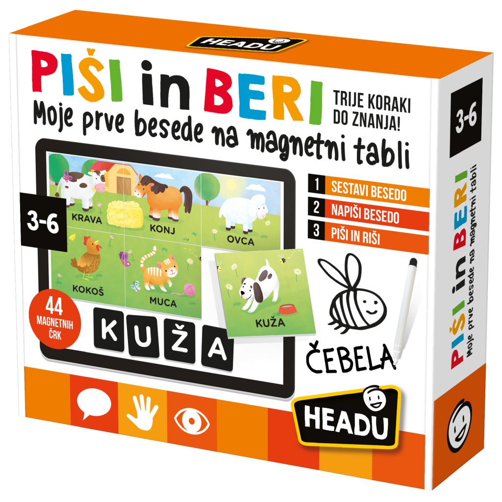 S to igro se otroci naučijo prepoznavati črke abecede ter brati in pisati svoje prve besede. Ob tem razvijajo tako jezikovne kot tudi telesno-gibalne, vizualno-prostorske in logično-matematične spretnosti. Igra spodbuja naslednje sposobnosti: pisanje prvih besed, širjenje besedišca, fino motoriko, vizualni spomin, prve asociacije in razvrščanje. Pred začetkom igre starš ali učitelj pripravi material tako, da na zadnjo stran črk in kosov sestavljank na označene črne kroge pritrdi magnetne ploščice. Igra vsebuje belo magnetno tablo, štiri tematske sestavljanke (vsaka s šestimi deli), 44 črk, 70 malih magnetov in pisalo piši briši. Vsaka sestavljanka predstavlja svojo zgodbo s šestimi predmeti. Sestaviš lahko: mesto, kmetijo, otroško sobo ali kuhinjo.