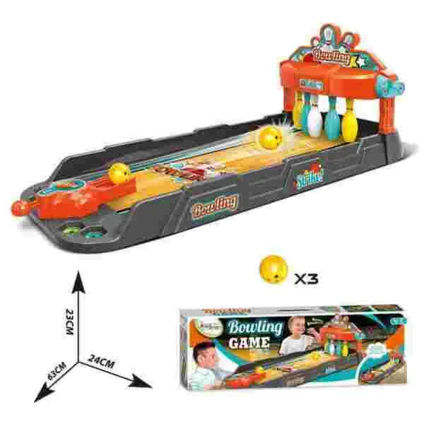Namizna igra bowling je primerna za 1-2 igralca. Postavi žogico na začetno pozicijo, ciljaj in s pomočjo ročice streljaj. Cilj igre je podreti čim več kegljev. Dimenzija: 63 x 24 x 23cm. Primerna za otroke starejše od 3 let.