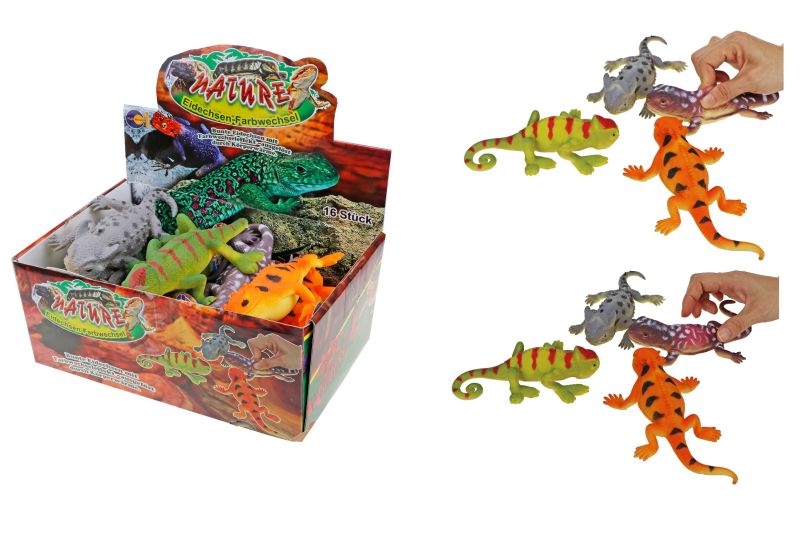 Majhni kuščarji so razteglji in reagirajo na telesno toploto. Pazi, ko kuščarji spreminjajo barvo. Za igranje, raztezanje in stiskanje. Primerno tudi za lajšanje stresa. 4 različne variante, dolžina približno 16cm Primerno za starost 3l+