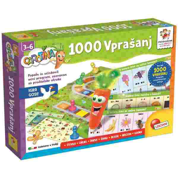 Carotina 1000 vprašanj je popoln učni pripomoček s številnimi interaktivnimi učnimi karticami. Ob pravilnem odgovoru pisalo zasveti in malčka nagradi z veselim vzklikom. Ob izbiri nepravilnega odgovora pa spodbudi k ponovnemu poskusu. Otrok se skozi igro nauči abecede, besed, števil, logičnega razmišljanja, oblik, barv in živali.