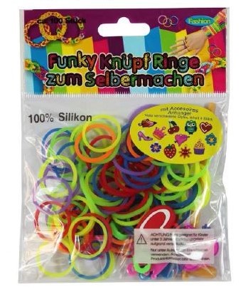 V setu: 100 silikonskih barvnih elastik, 6x sponke za zapenjanje, 1x kvačka. V displeju 3 vsrte elastik: klasične večbarvne elastike, svetleče v temi in z bleščicami.