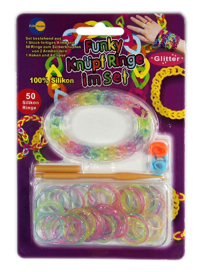 V setu: 50 silikonskih barvnih elastik z bleščicami, 2x sponki za zapenjanje, 1x kvačka in 1x že sestavljena sestavljanka zapestnica.