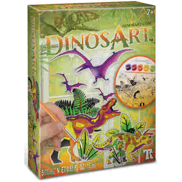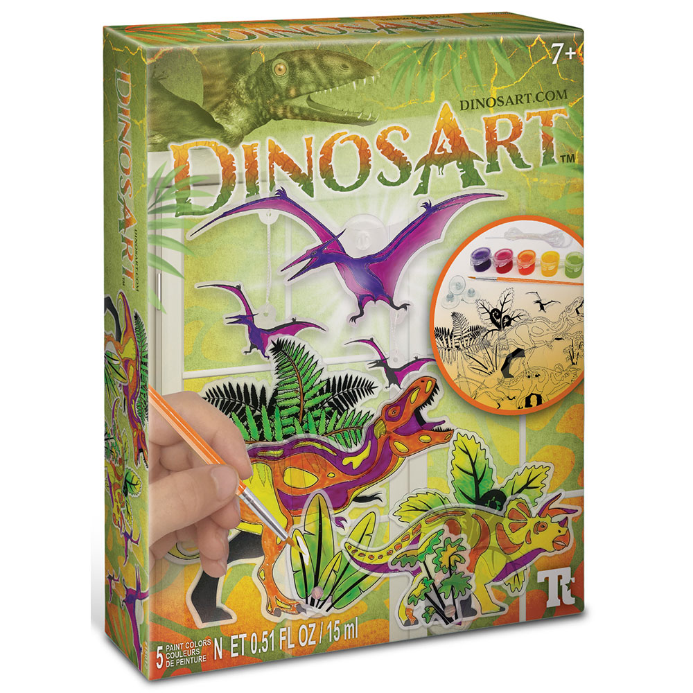 Ustvarite tri okenske obešanke z dinozavri. Predlogo pobarvajte, dodajte prisesek in pritrdite na okno ali ogledalo.