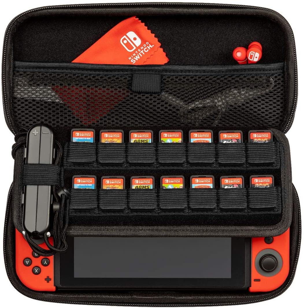 Trdno ohišje z ročajem za hiter in varen oprijem, notranji del torbe je mehak in varno zaobjame konzlo, na nastavljivem srednjem delu je prostora za 14 iger in majhne dodatke.