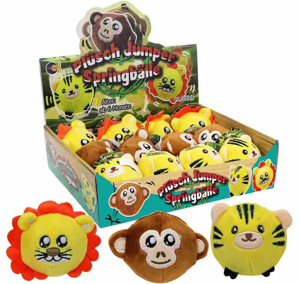 Plišasti skakalec je prikupna žogica. Super odbojna žogica, motiv levček, opica ali tigrček. Premer 70mm Primerno za starost 6m+