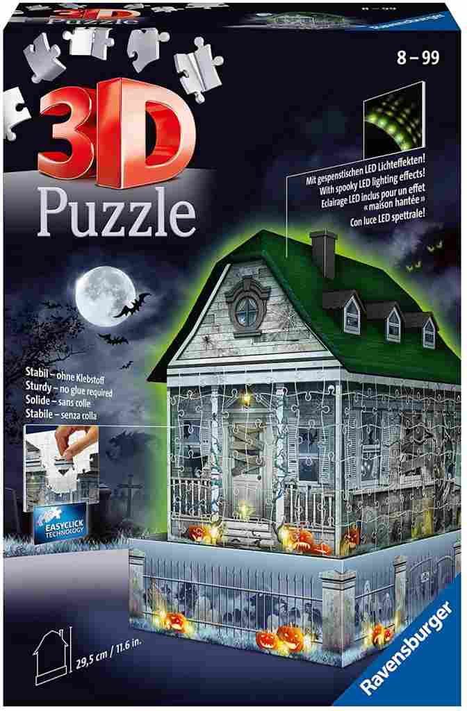 Ravensburgerjeva 3D sestavljanka "Haunted House" omogoča sestavljanje atraktivnega tridimenzionalnega modela strašljive hiše. Sestavljanka vsebuje 216 kosov, ki se natančno prilegajo brez uporabe lepila. Posebnost sestavljanke je, da sveti v temi, kar poudari njen strašljiv videz in jo naredi odlično dekoracijo za tematske dogodke, še posebej za noč čarovnic.