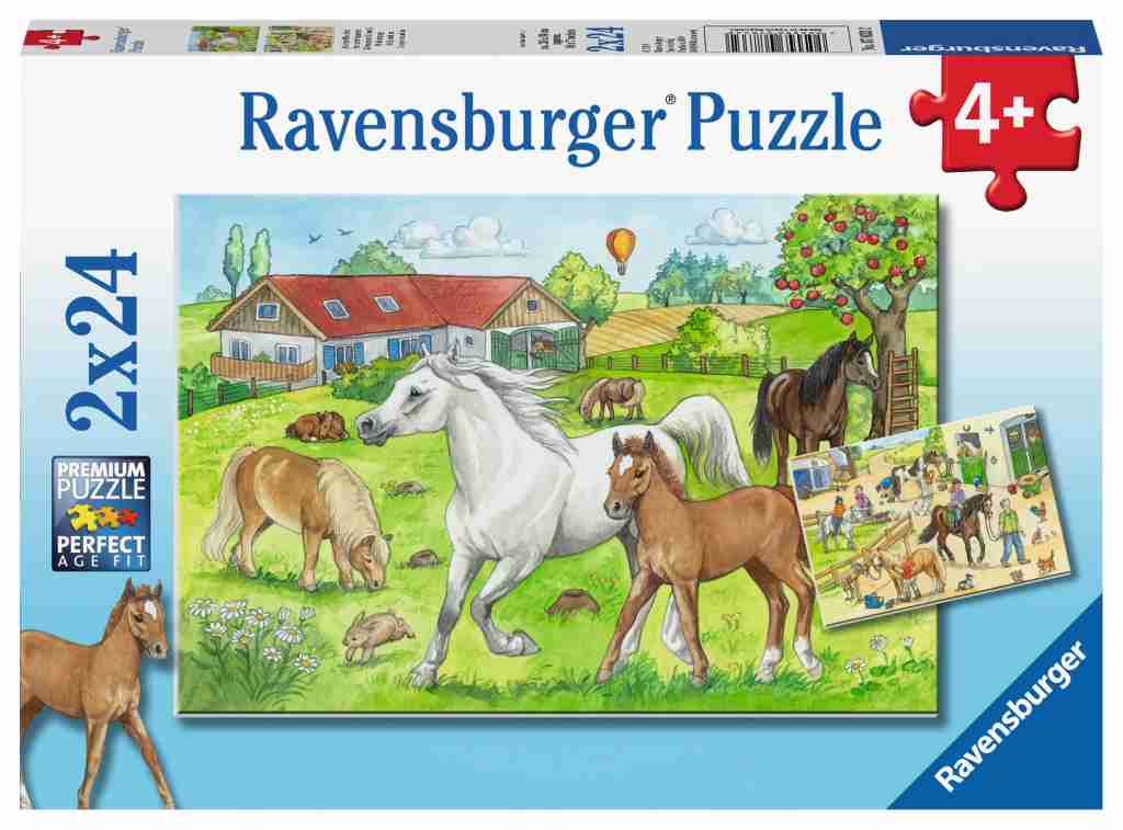 Na kmetiji je vedno zanimivo. Konji se prosto gibajo v ogradi, druga slika prikazuje še ostala dela s konji. Podkovanje, krtačenje, učenje jahanja. Sestavljanka 2×24 delov, ter mini poster, velikost slike 26 x 18cm. Pedagoško dragocen izdelek, z veliko učne zabave in izdelano iz trajnostno naravnanega gozdarstva. Primerno za starost 4l+