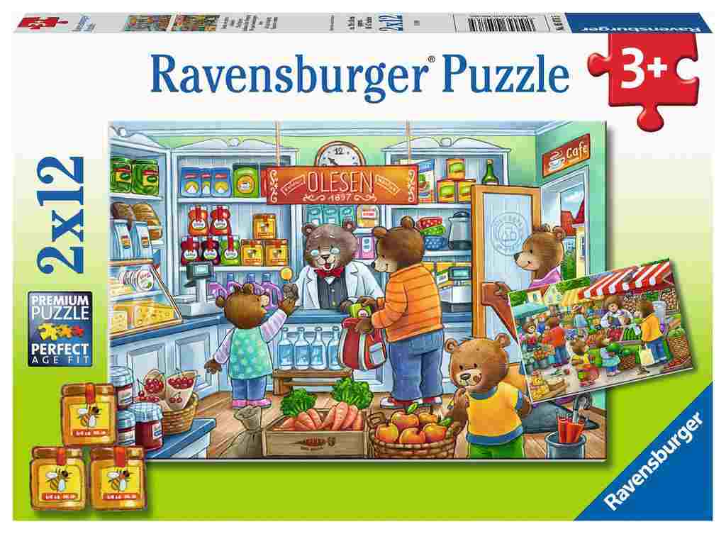 Puzzle, dajmo medvedki, gremo po nakupih v trgovino in na tržnico, dvojna sestavljanka. Sestavljanka 2x12delov, ter mini poster, velikost slike 26 x 18cm. Pedagoško dragocen izdelek, z veliko učne zabave in izdelano iz trajnostno naravnanega gozdarstva. Primerno za starost 3l+