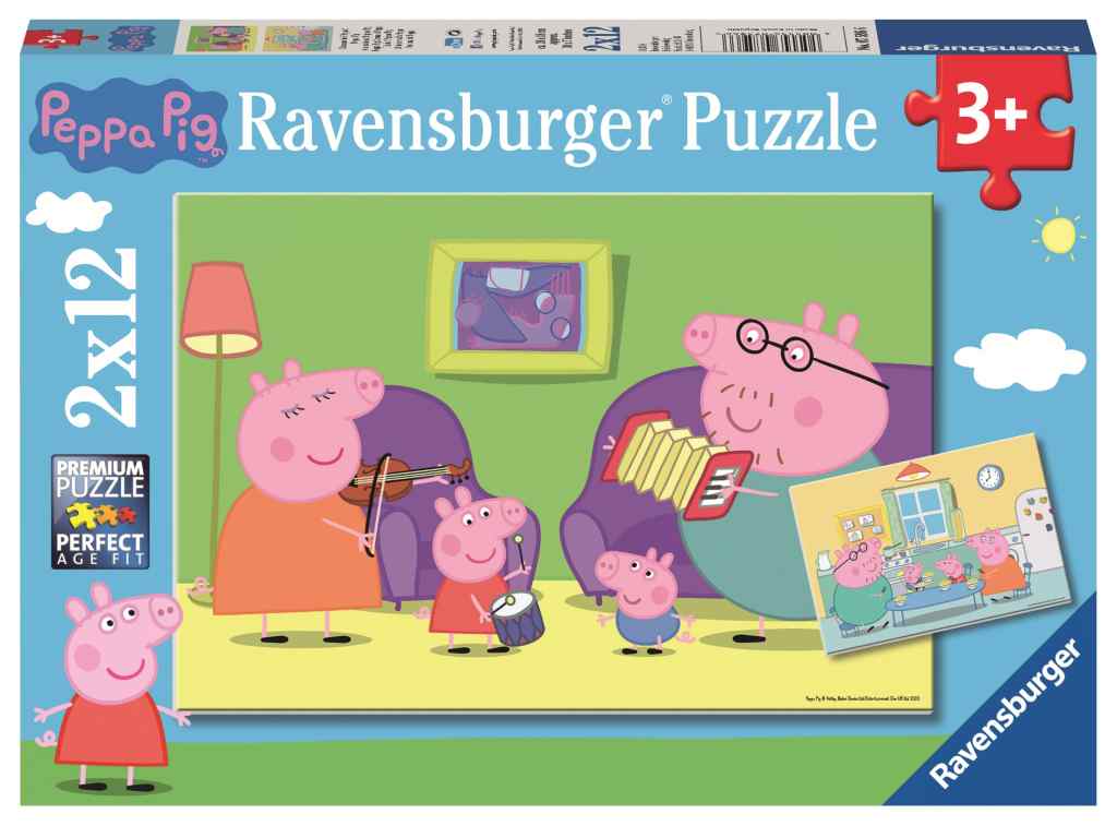 Pujsa Pepa doma. Z mamo pujso in očetom pujsom se družijo in zabavajo. Sestavljanka 2×12 delov, ter mini poster, velikost slike 26 x 18cm. Pedagoško dragocen izdelek, z veliko učne zabave in izdelano iz trajnostno naravnanega gozdarstva. Primerno za starost 3l+