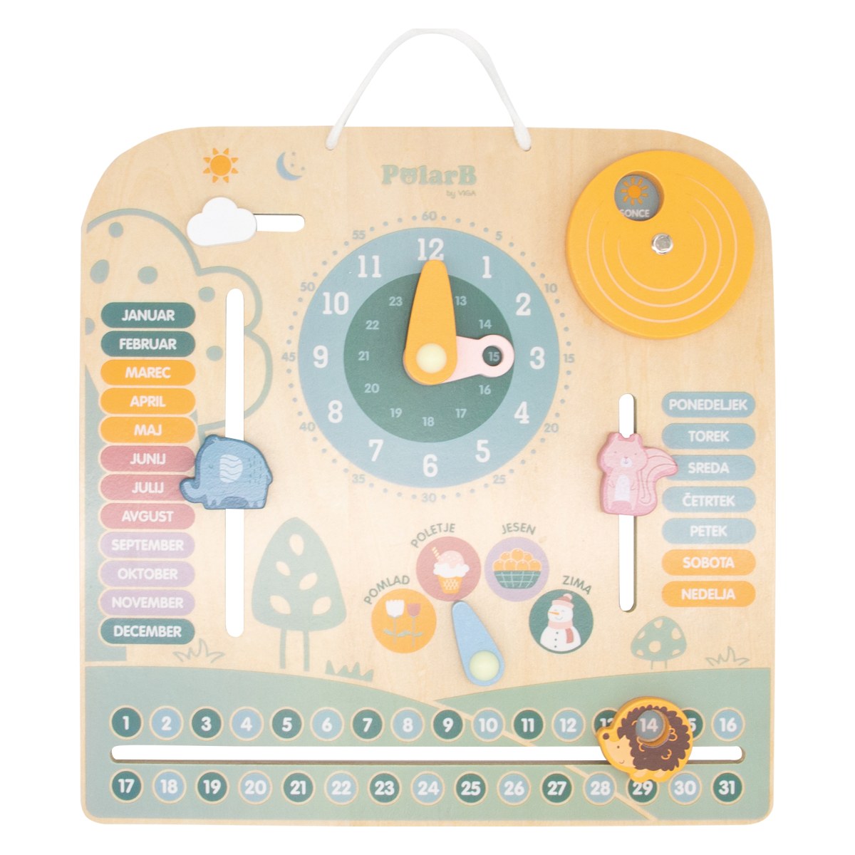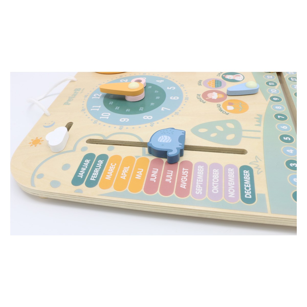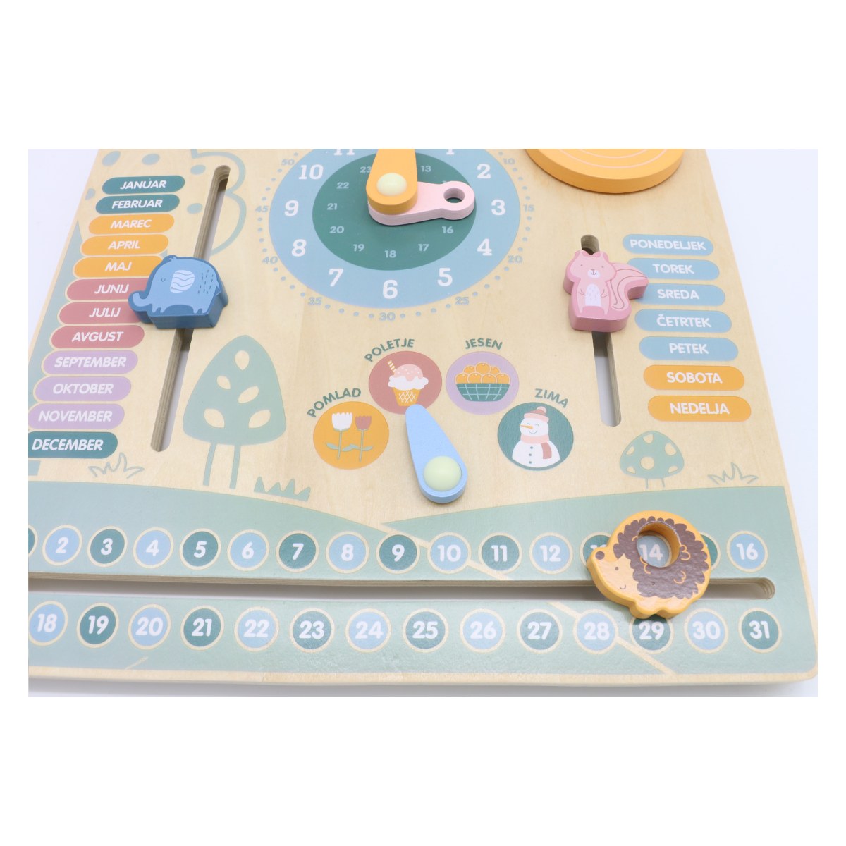 Koledar v slovenskem jeziku s katerim otrok spozna dneve, mesece, vreme, letne čase, datum in čas na zabaven in hkrati poučen način. Skozi igro treniramo otrokovo koncentracijo, potrpljenje, fino motoriko, spomin in razmišljanje, hkrati pa mu na nevsiljiv način podajamo vrsto zanimivih informacij, ki si jih otrok zelo dobro zapomni.